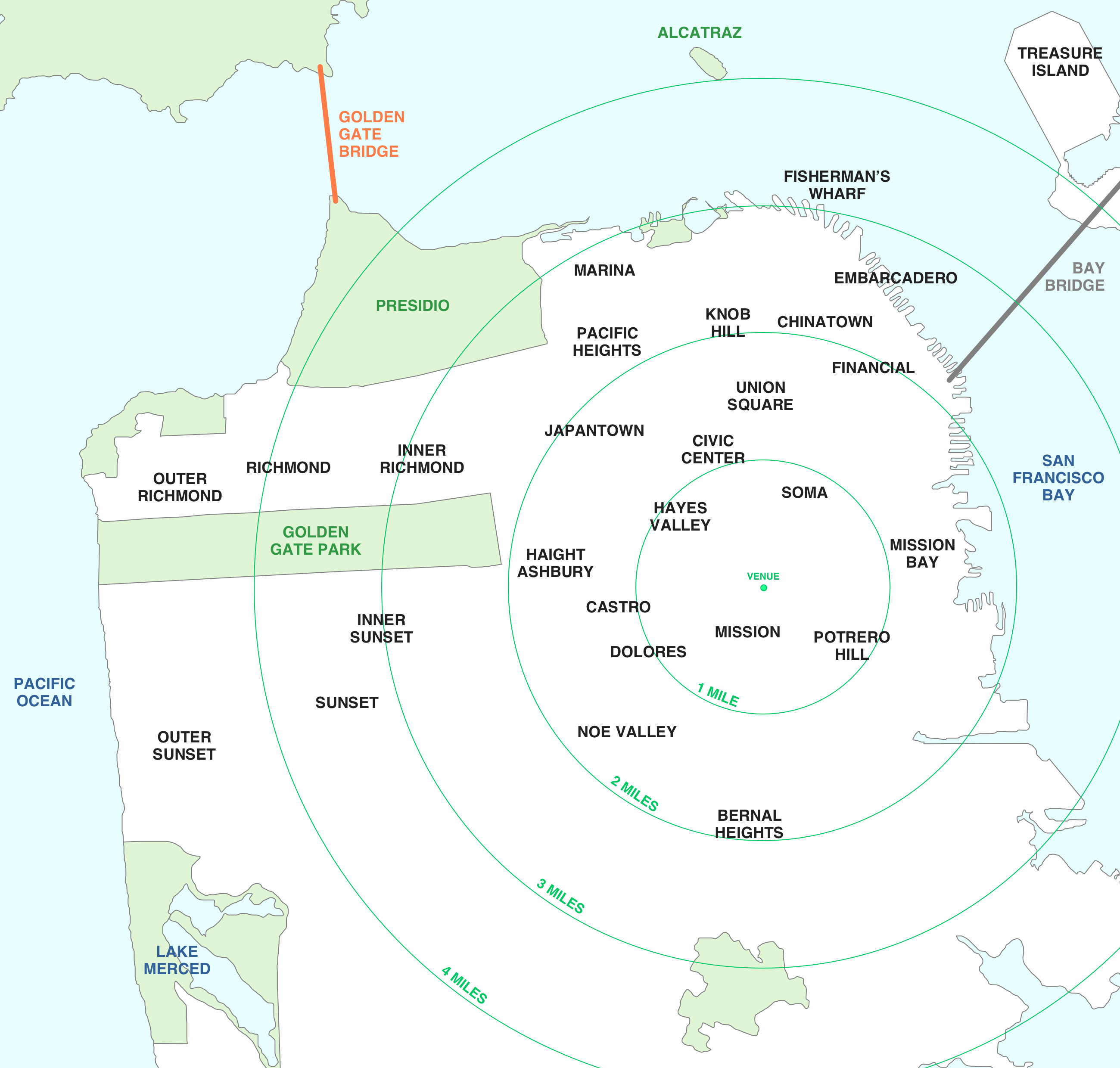 For visitors, a map of San Francisco neighborhoods with distances to the venue. Try to stay within 2 miles of the venue to avoid traffic.
